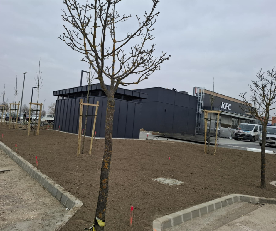 - Munka leírása:Ajka KFC gyorsétterem területén fák és dísznövények telepítését, füvesítést, valamint egy modern öntözőrendszer kiépítését végeztük el.