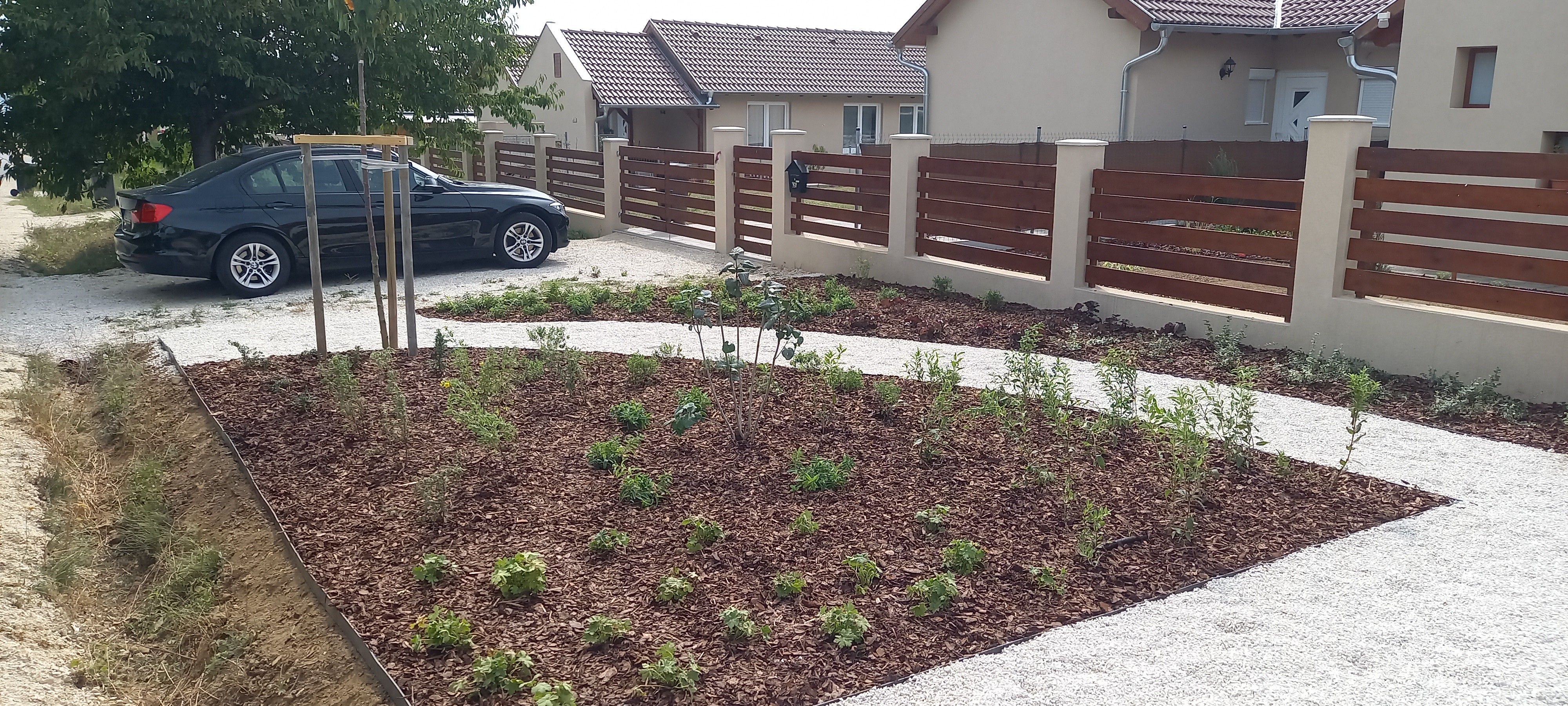 A tulajdonosok példamutatásként, de elsősorban saját örömükre megterveztették az előkertet és a rövid kocsibeállót is.
