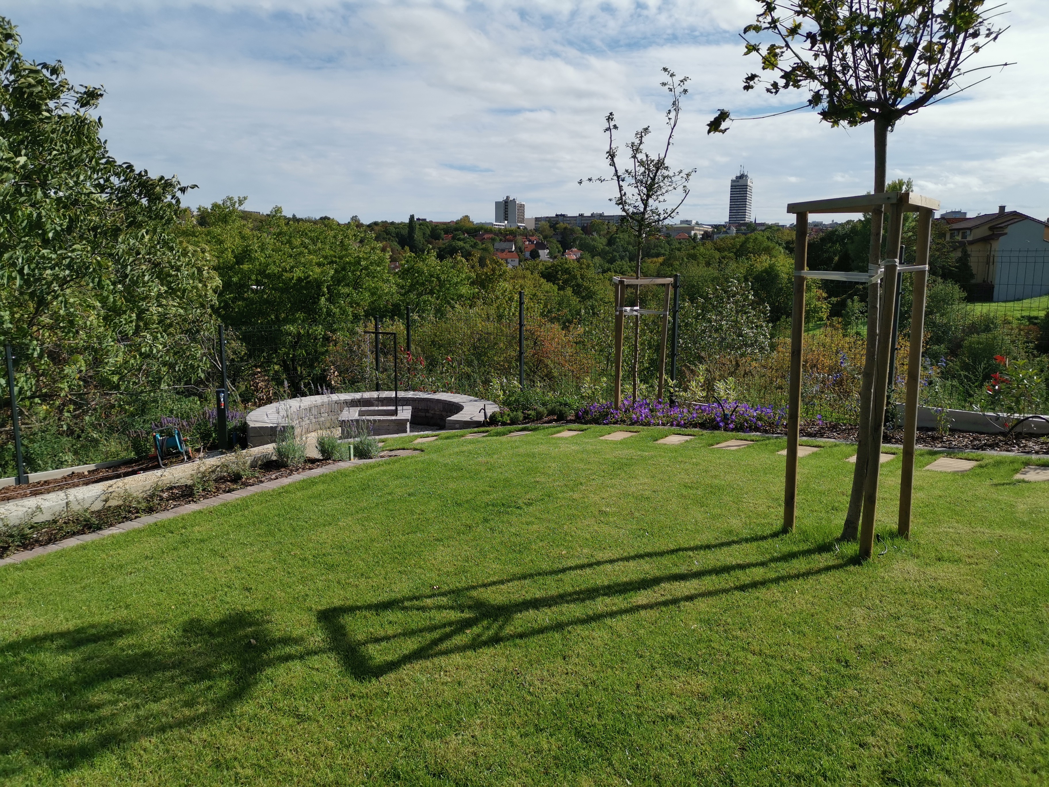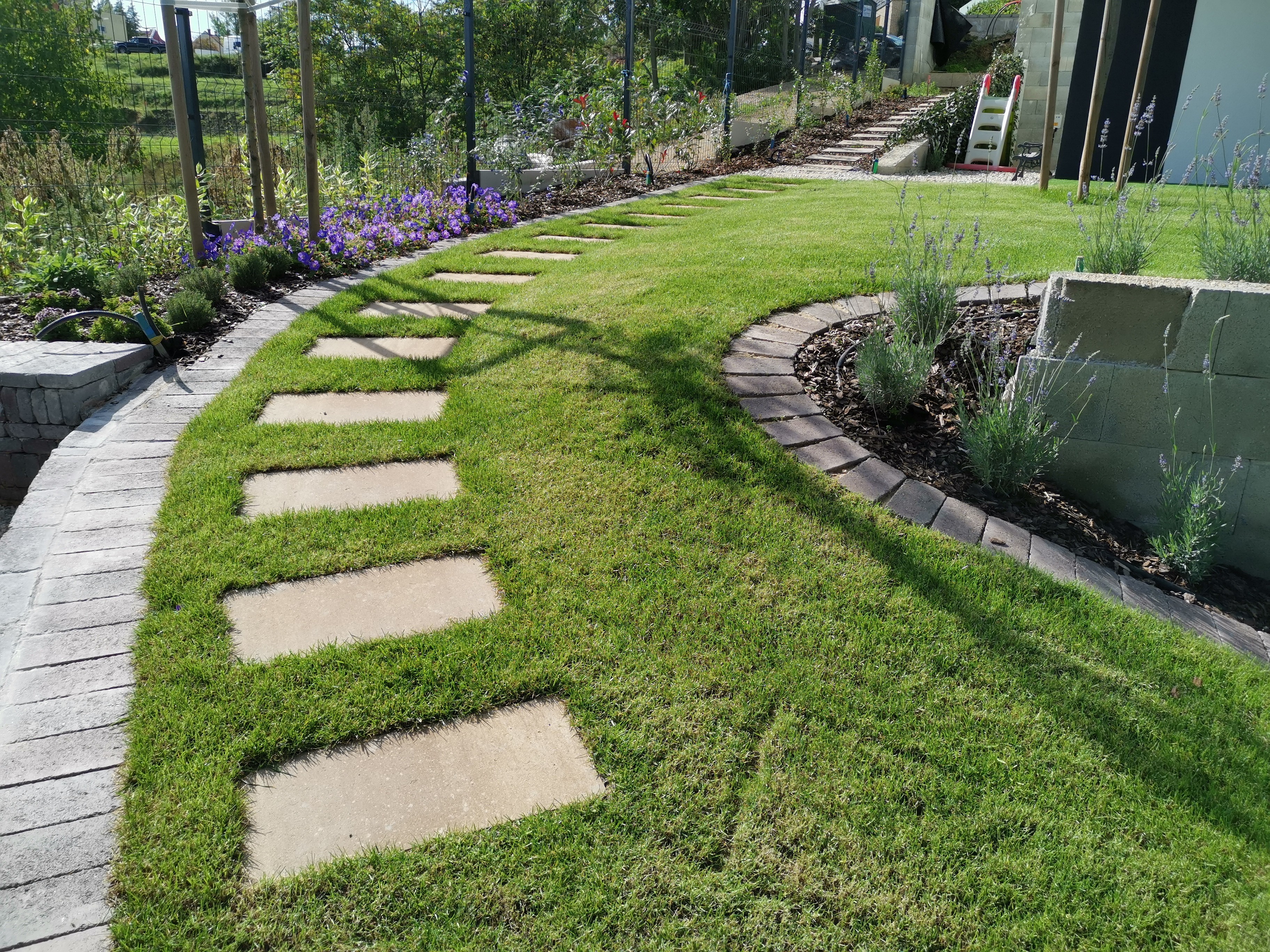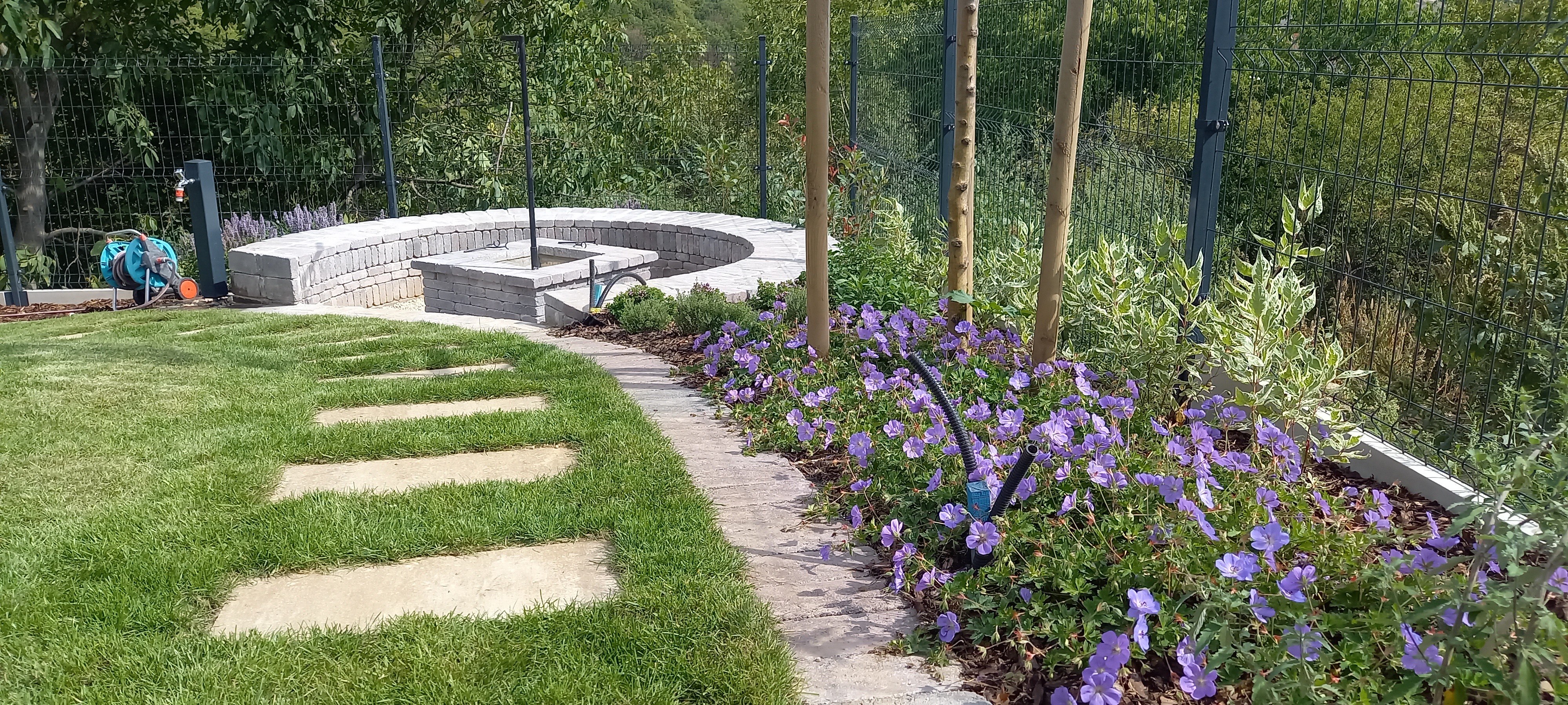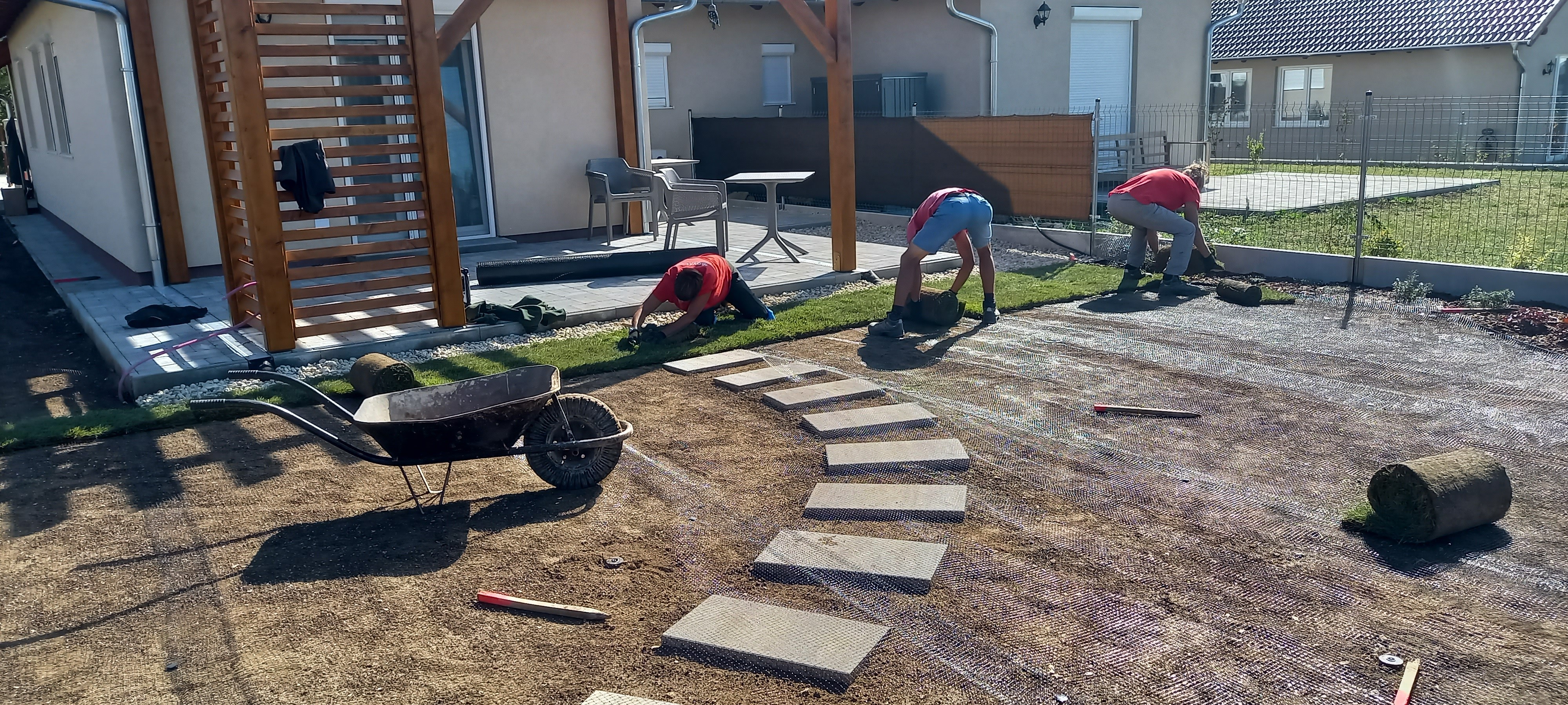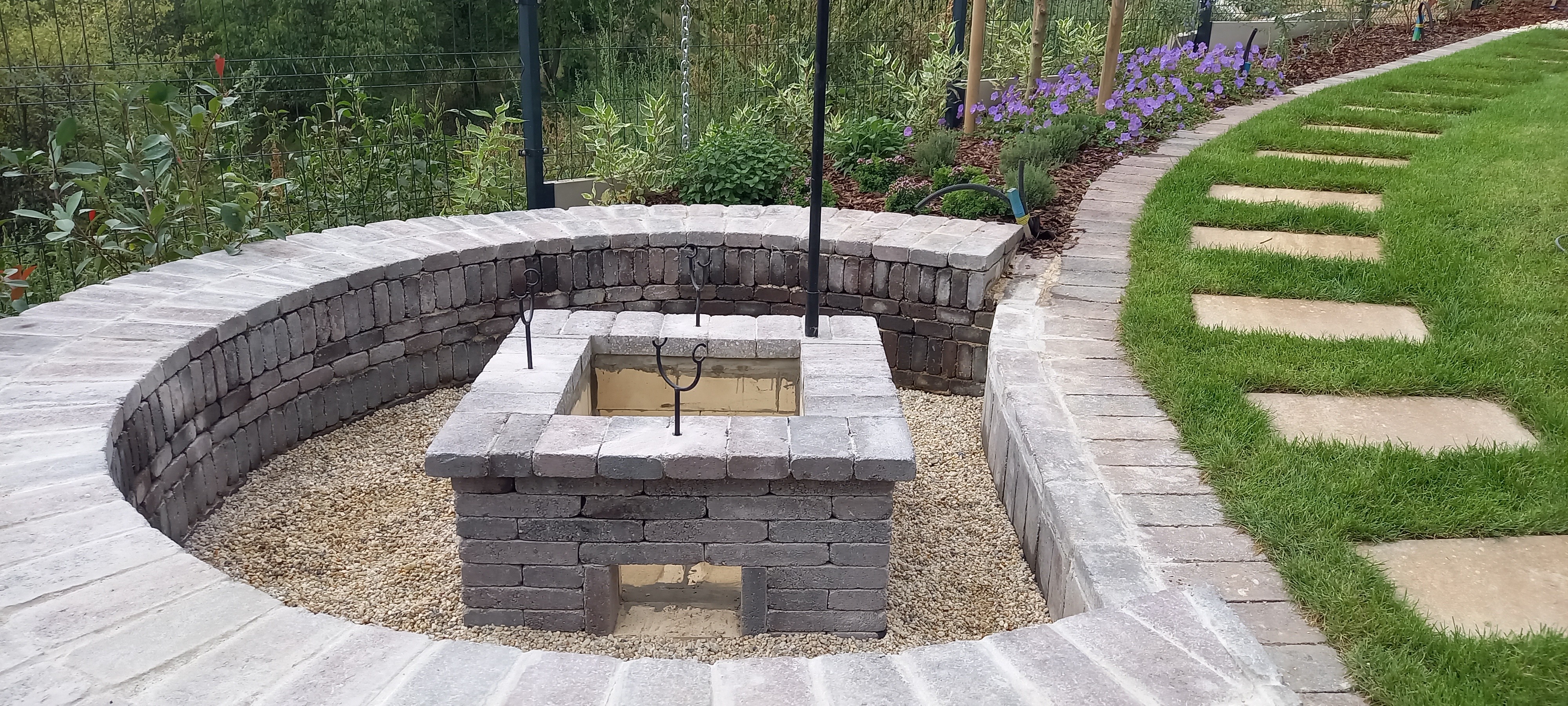 Végül utóbbi mellett döntöttünk és a számunkra alapvető öntözőépítési, növénytelepítési és füvesítési feladatok mellett a burkoláshoz szükséges betonalapok, a lépcső is általunk készült el és a sütőhellyel és az azt körbeölelő ülőtámfallal is sikeresen megbirkóztunk.