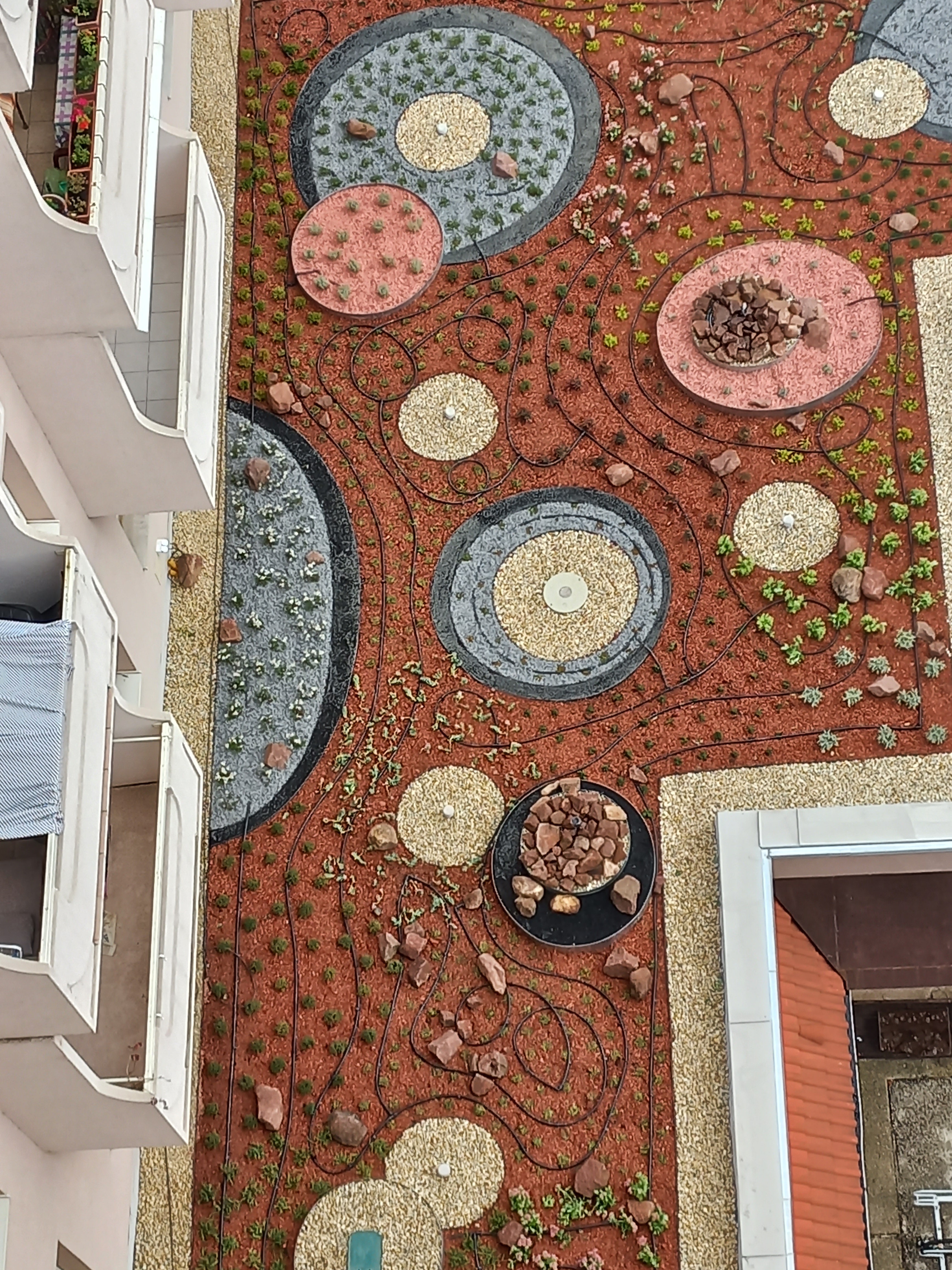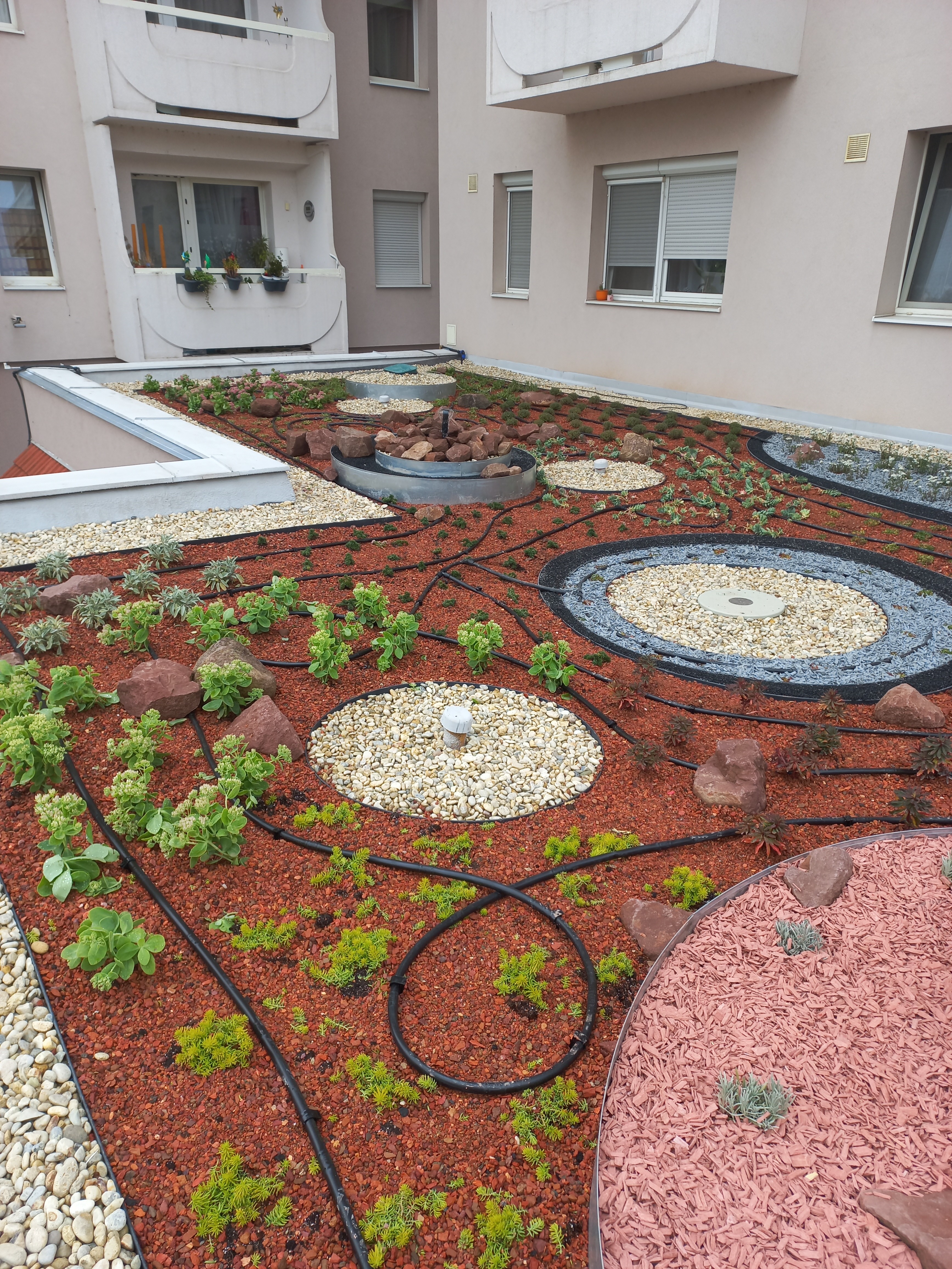 Végül kompromisszumos megoldást kötöttünk: mivel a víz már fent volt és a próbaterhelésre jól reagált a födémünk, így a könyvtár vasbetonfalaira 1-1 csobogót helyeztünk, beleillesztve azt a köralakú ágyásokból összeálló koncepcióba.