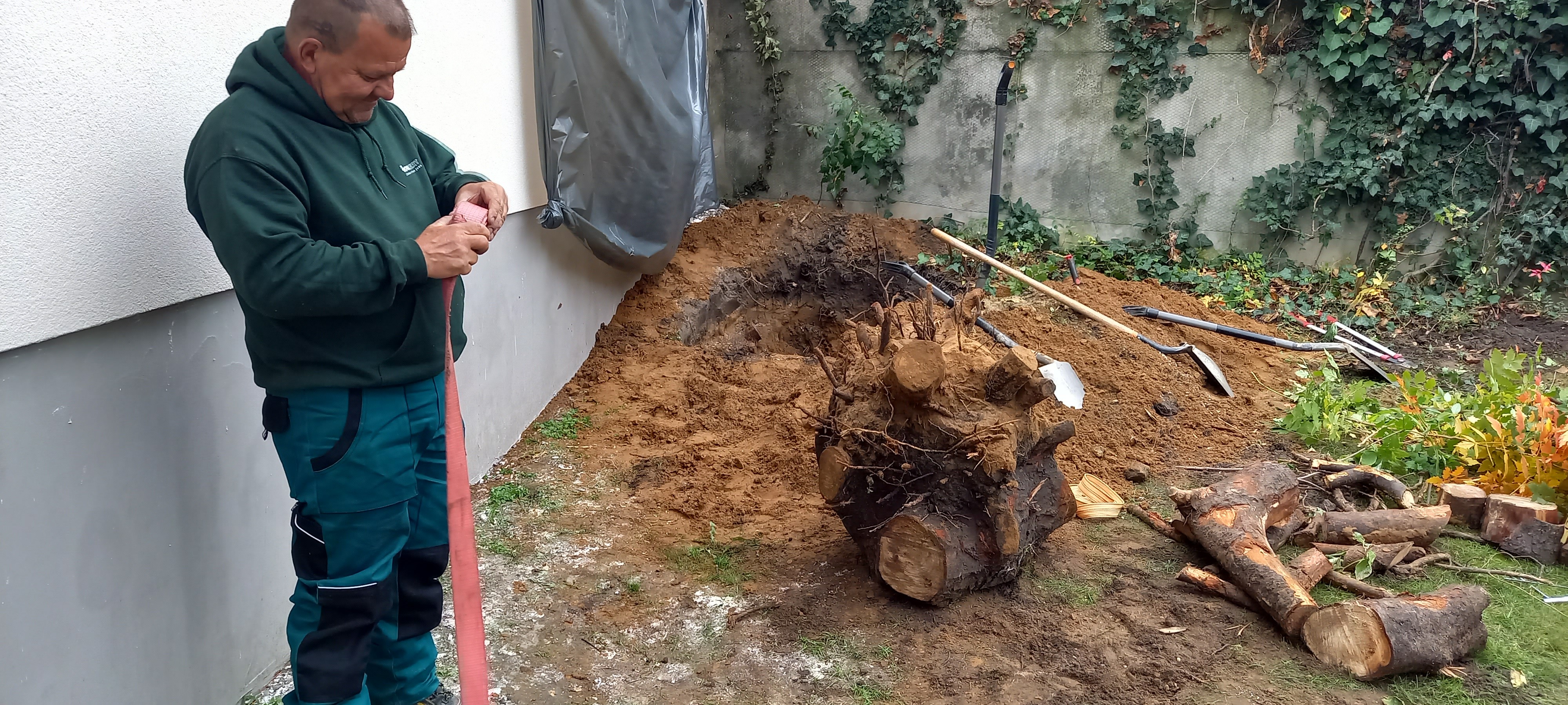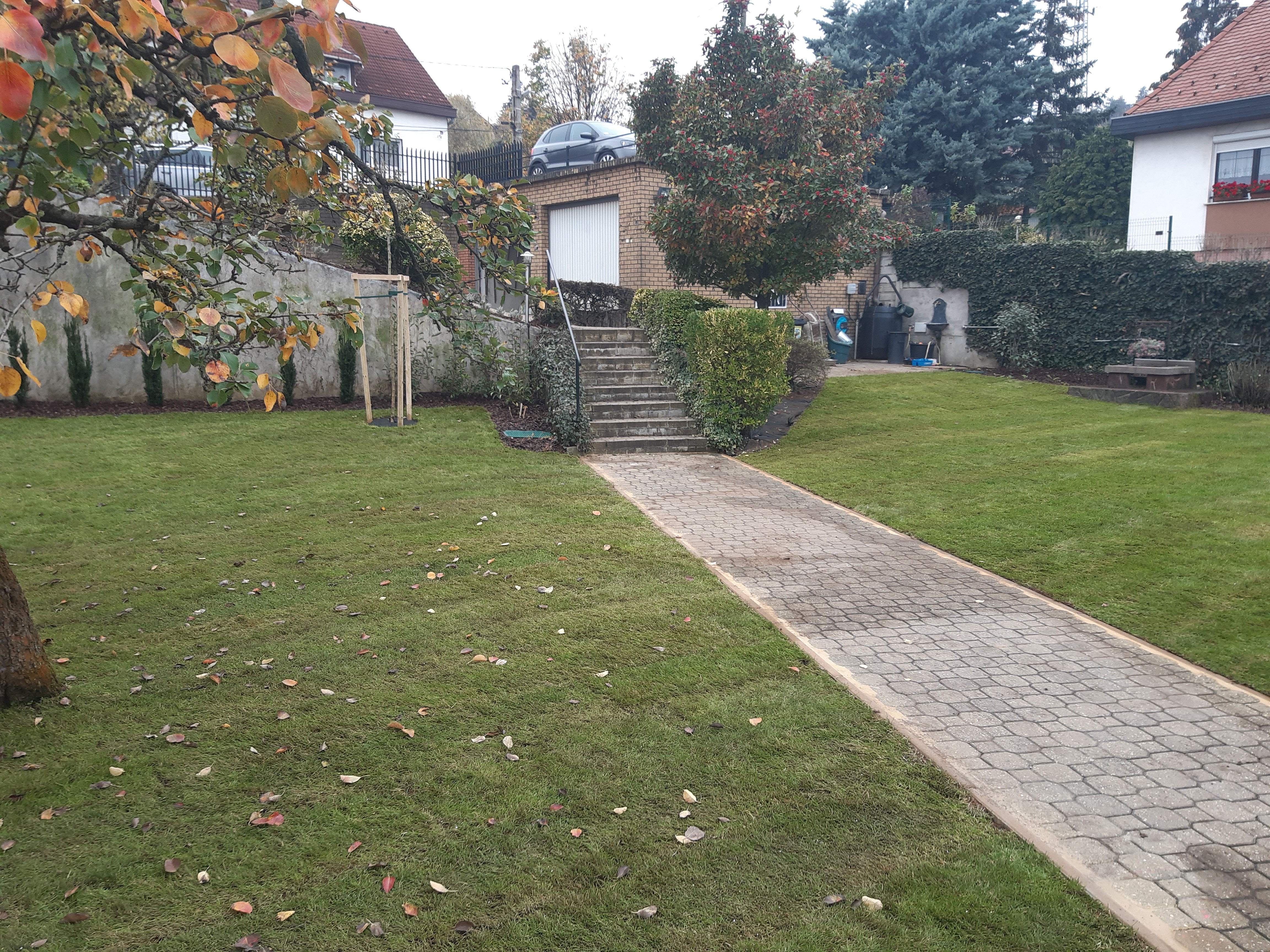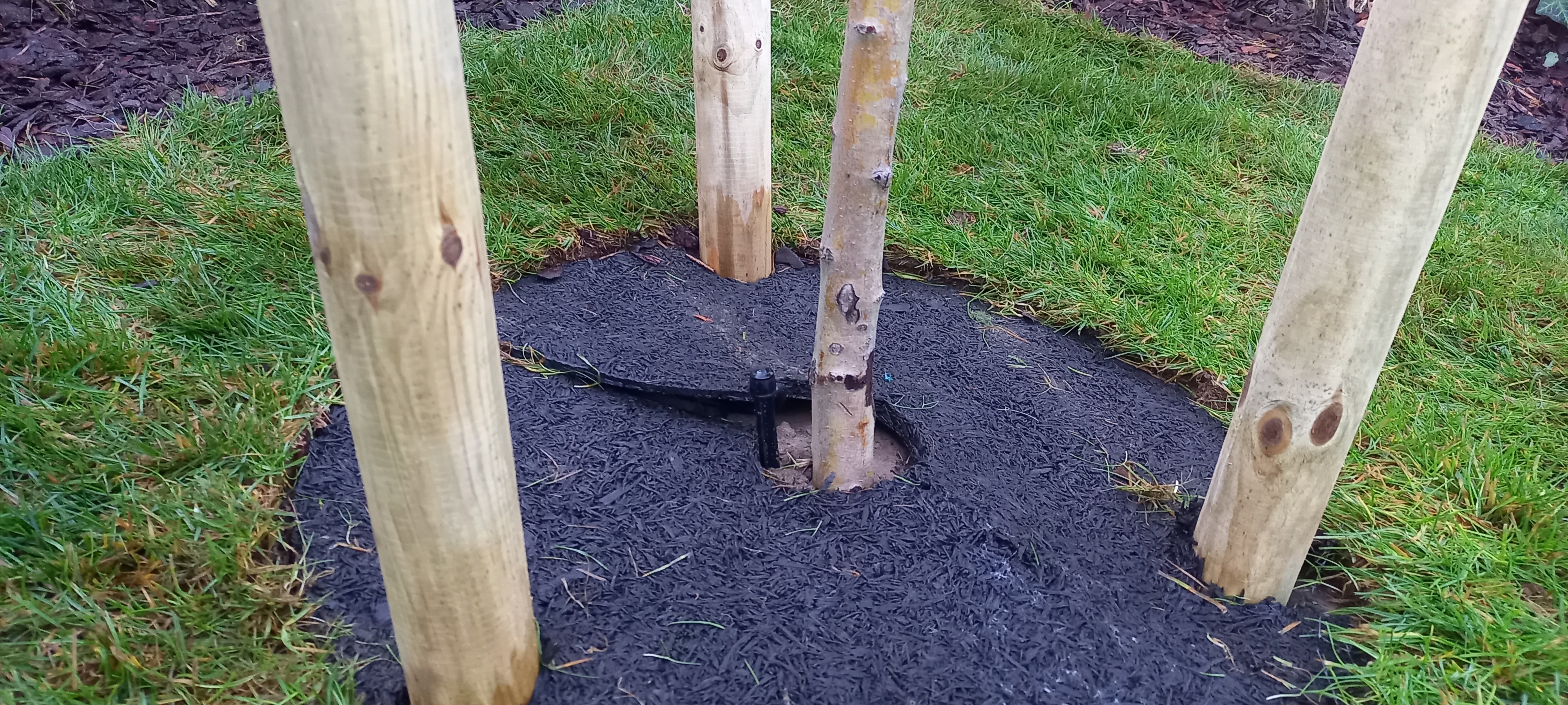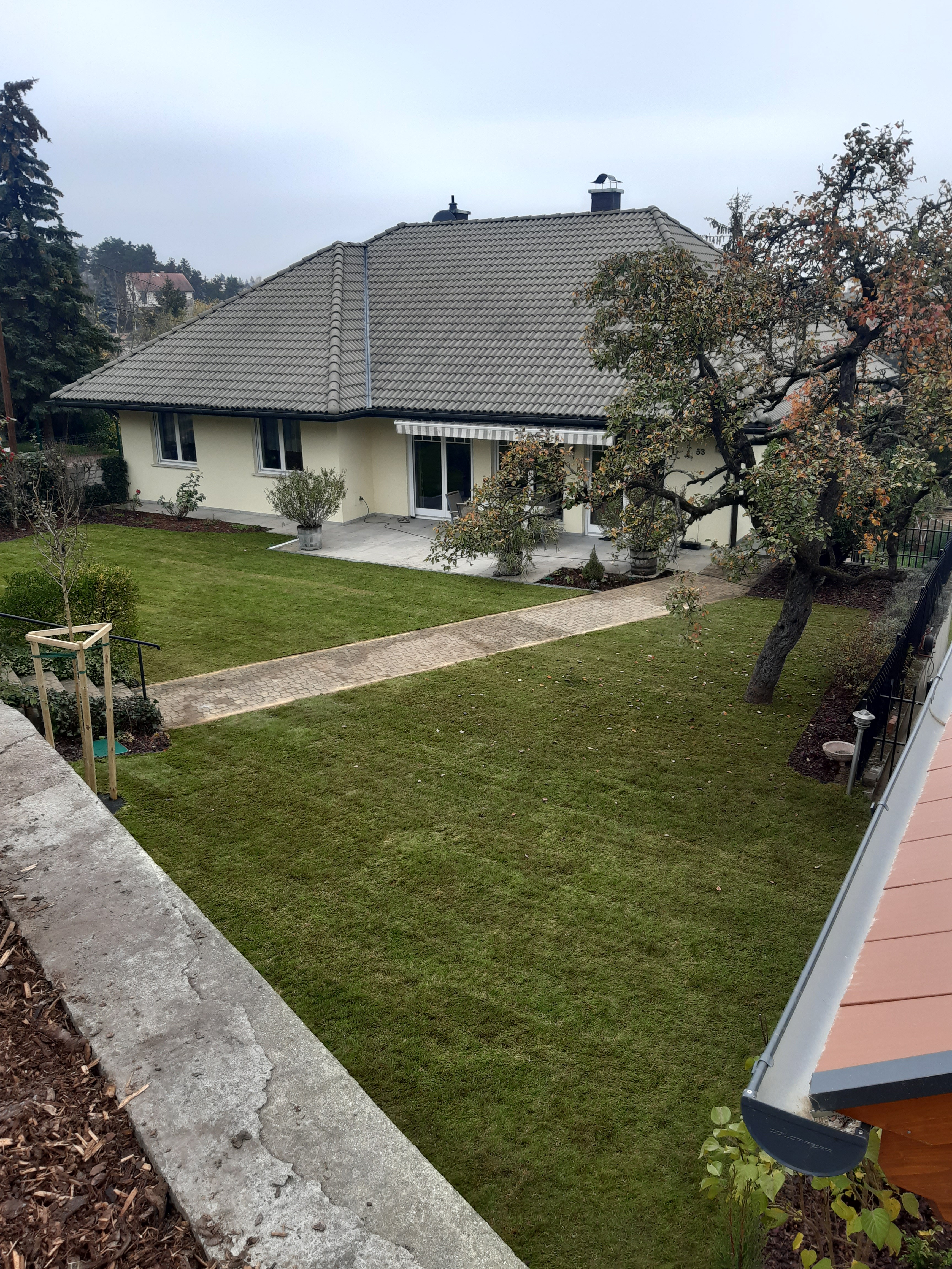A fa törzséhez tőöntöző és gumilap került, hogy az fatörzsénél erőteljesen növekedő fűszálaknak ne hagyjunk helyet. Összességében tehát nem sok kerti feladatot hagytunk, viszont szabadon hagytunk egy ágyást a tulajdonosok által kedvelt, egynyáriak ültetésére.
