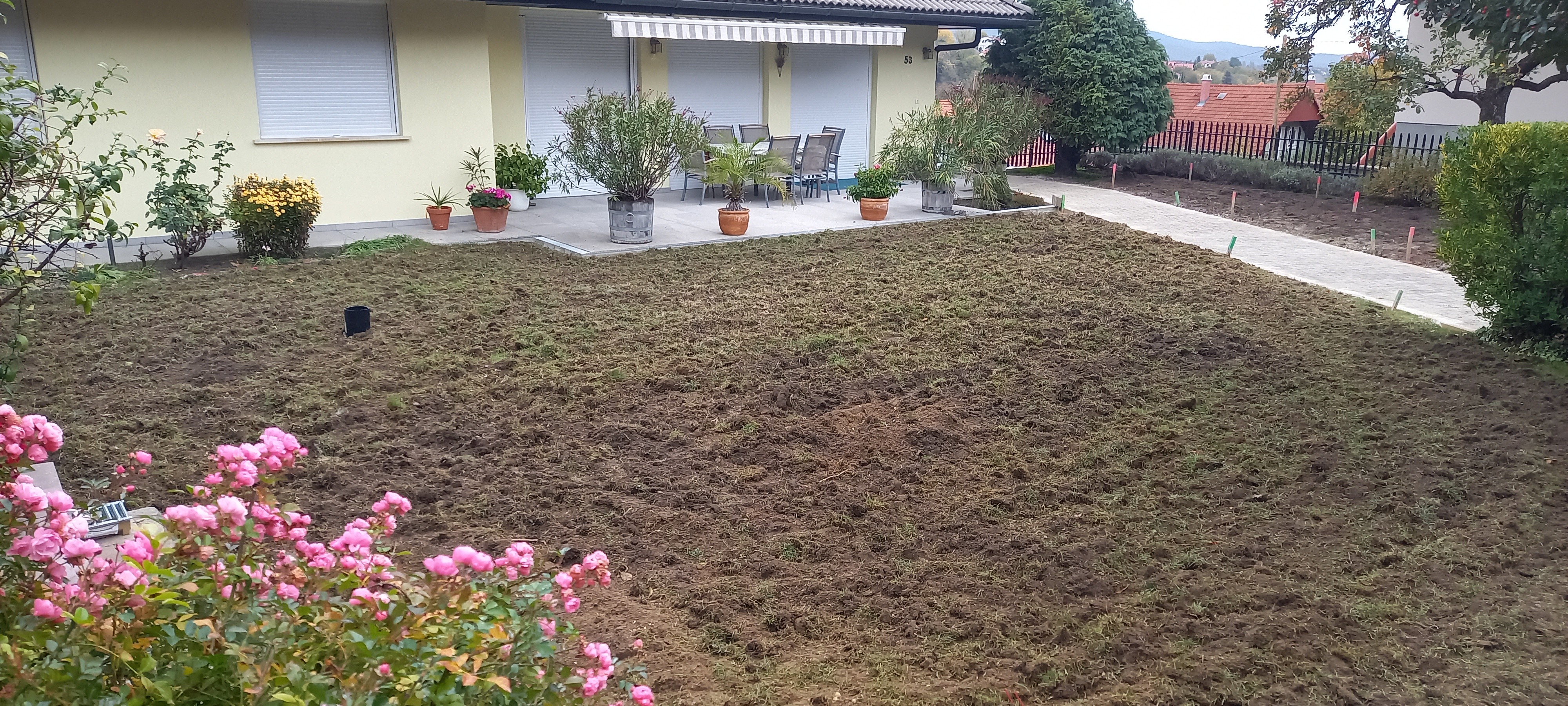 A füvet robotfűnyíró fogja vágni, ám nem volt igény az ágyások, robotfűnyíróhoz ajánlott, térkővel történő szegélyezése. Elegendő volt a műanyag szegély, mely nem vesz el a zöldből, de mellette előfordul, hogy a robot kósza szálakat hagy.