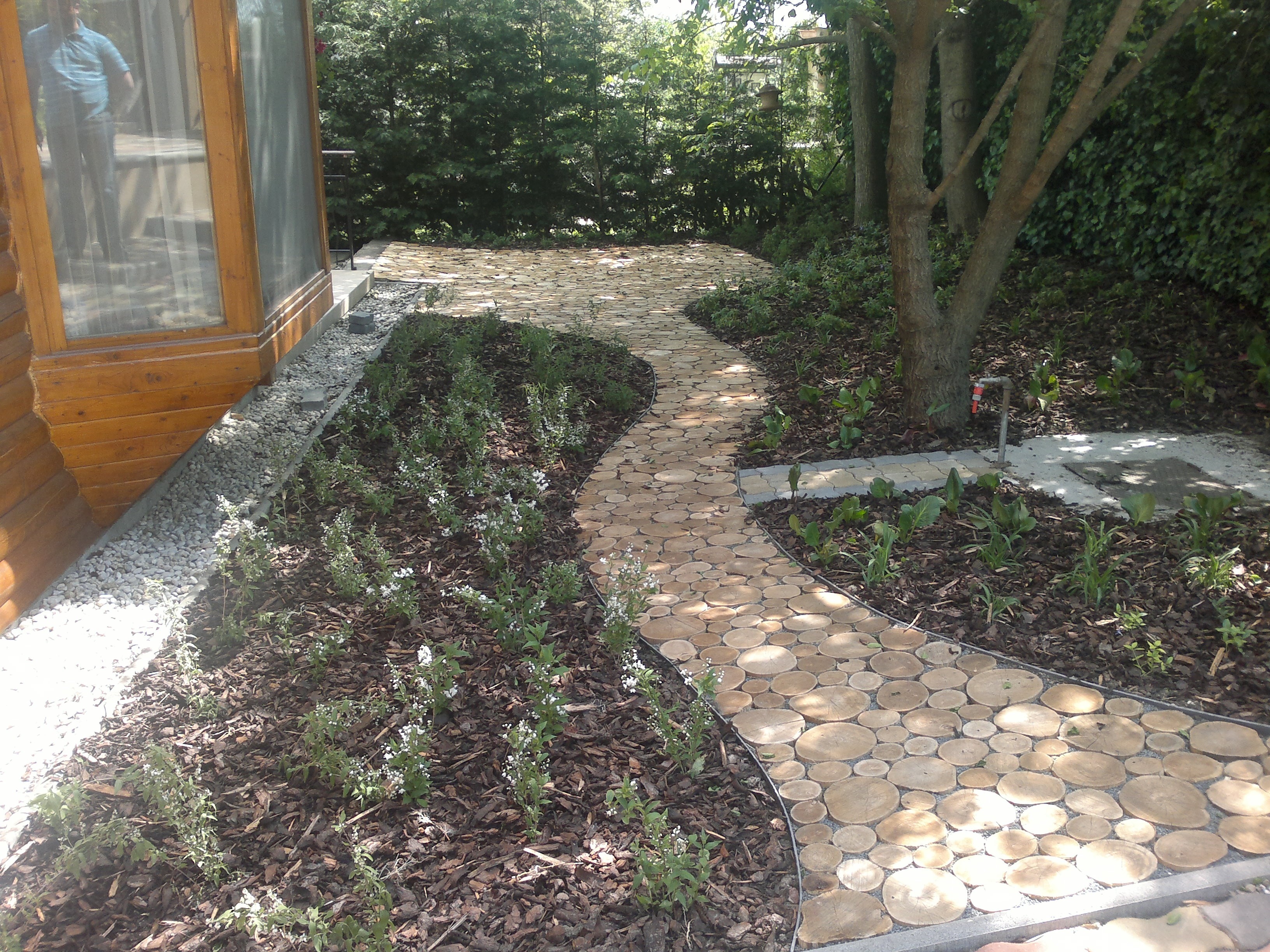 Természetes kertekben szép, a művi és a „vad” közötti áthidaló megoldás lehet a kemény fából készült fakorong burkolat alkalmazása. Ezt is a többihez hasonlóan zúzalék ágyazatra fektetjük.