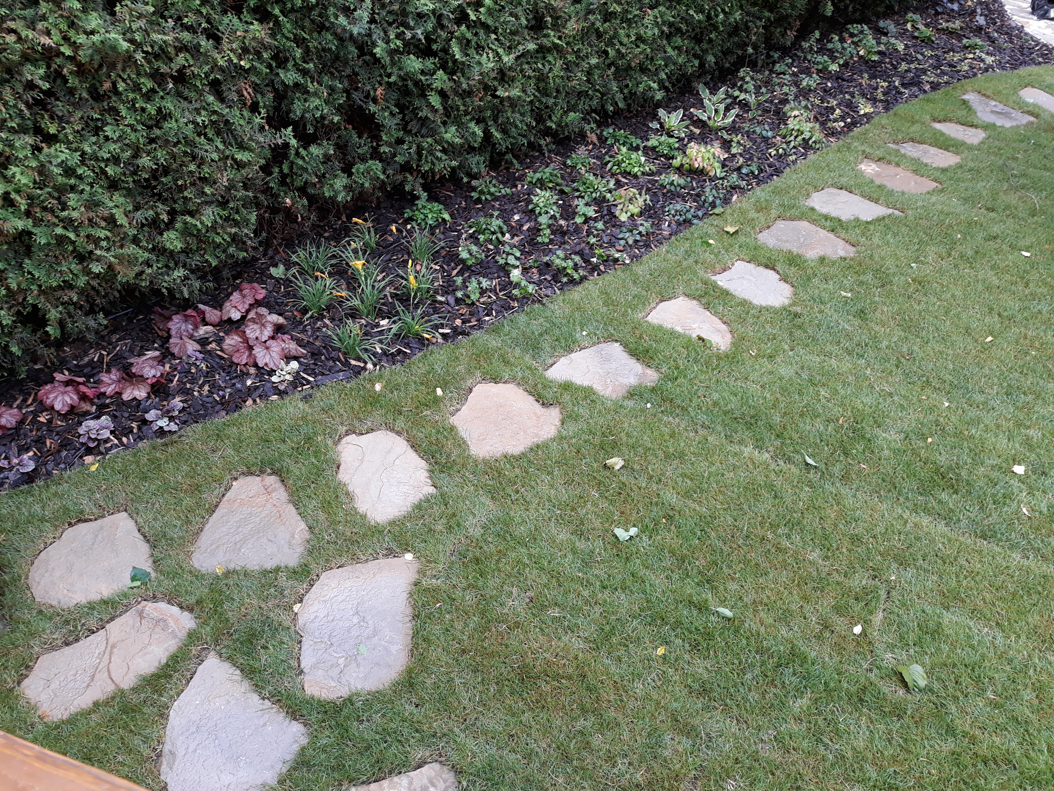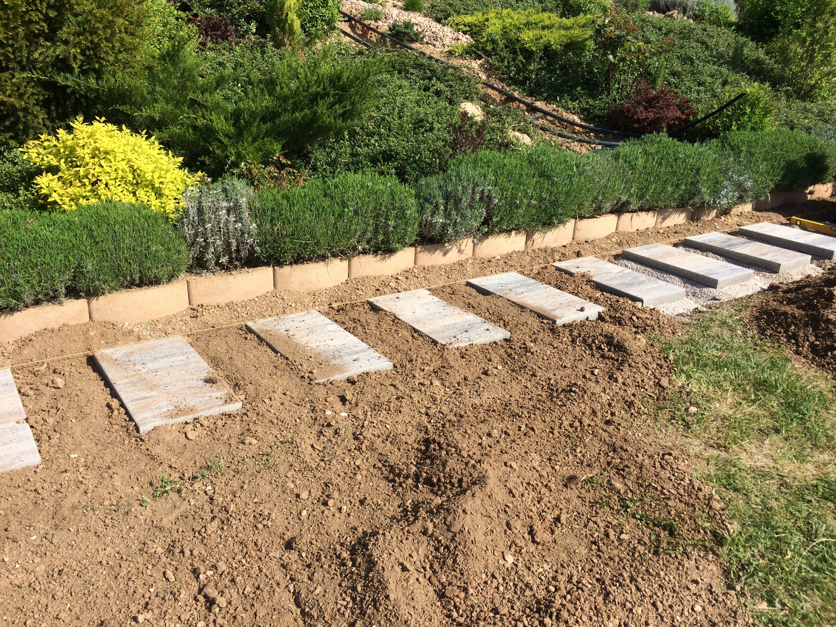 Azonban a kertünk nem minden részébe szeretnénk járdát vezetni, de mégis jó lenne száraz lábbal eljutni, pl. a komposztálóig. Ebben az esetben tipegőkövek alkalmazását javasoljuk, melyek nem vesznek el túl nagy teret a növényektől, gyepfelülettől. Ezek méretét, anyagát is a kerthez illesztjük. A szabálytalan terméskőtől a szabályos beton lapokig, nagyon bő a választék. A legfontosabb, hogy kényelmes lépőtávolságra kerüljenek és a lapok megfelelő méretűek legyenek (ne legyenek túl kicsik).