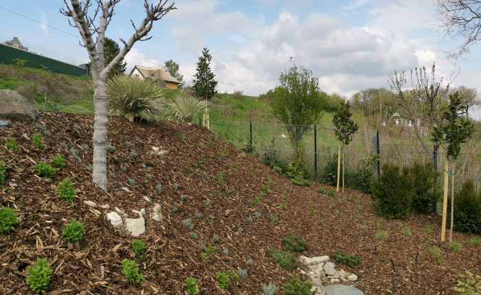 • Munka leírása:330m2-es meredek rézsűfelület komplett tervezése és kivitelezése (automata öntözőrendszer tartályról üzemeltetve, akác rönk ágyásszegély és útszegély kiépítése, évelőágyak telepítése meredek rézsűn, mulcsozás fakéreggel, magaságyás összeépítése)