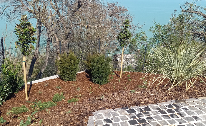 • rézsűmegkötő növényeket ültettünk a lejtős részekbe, míg a sík felületeken mediterrán jellegű örökzöldeket telepítettünk,