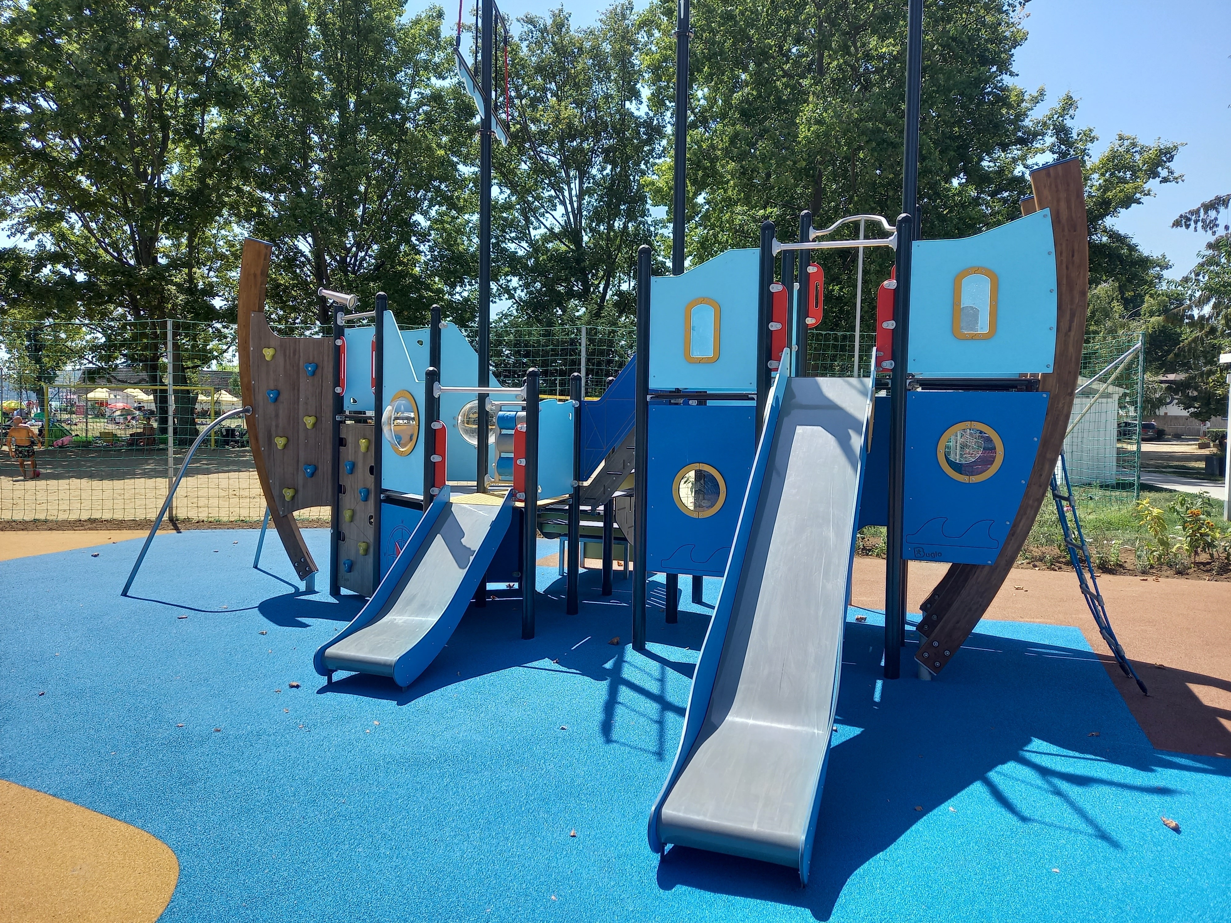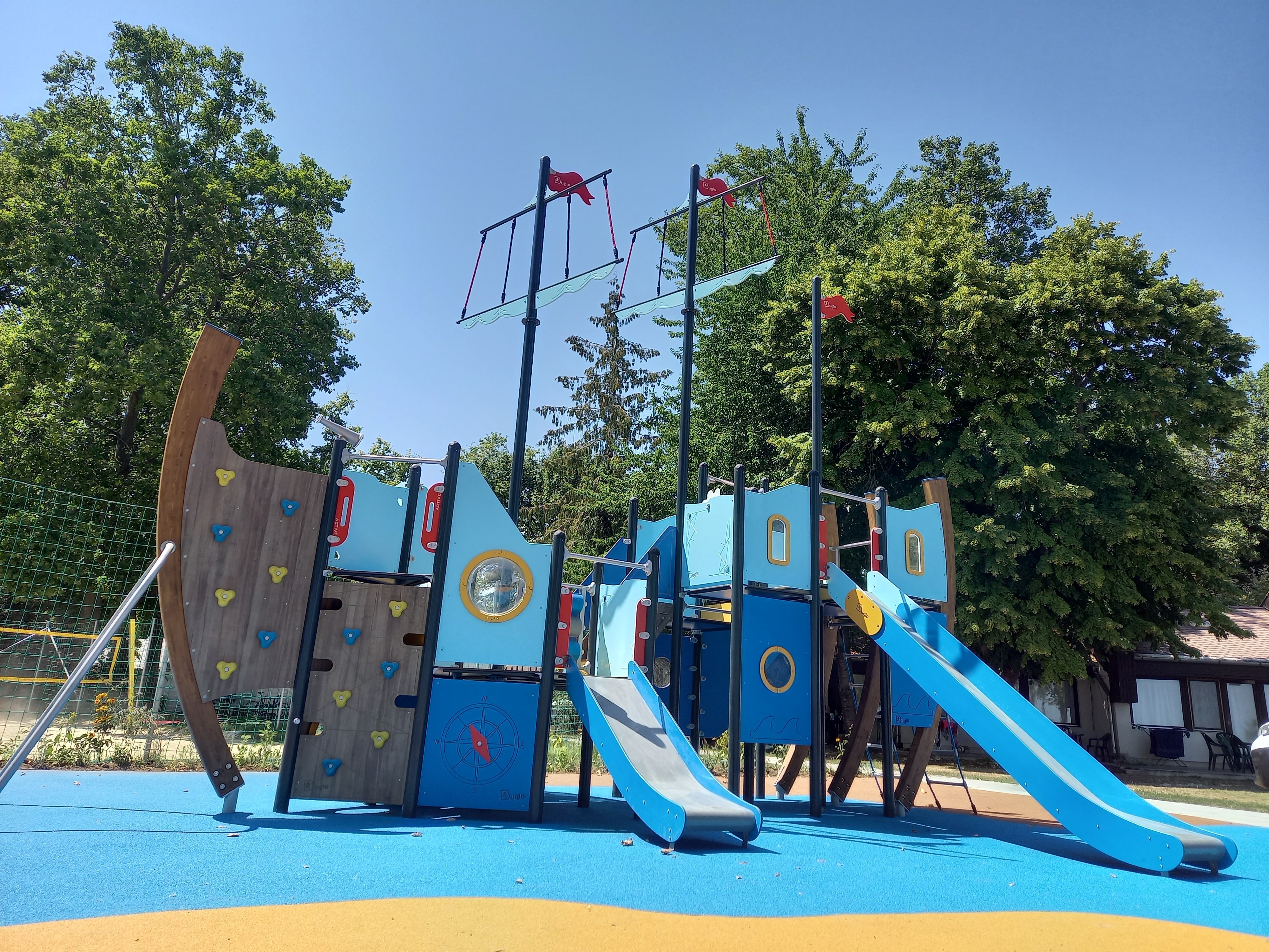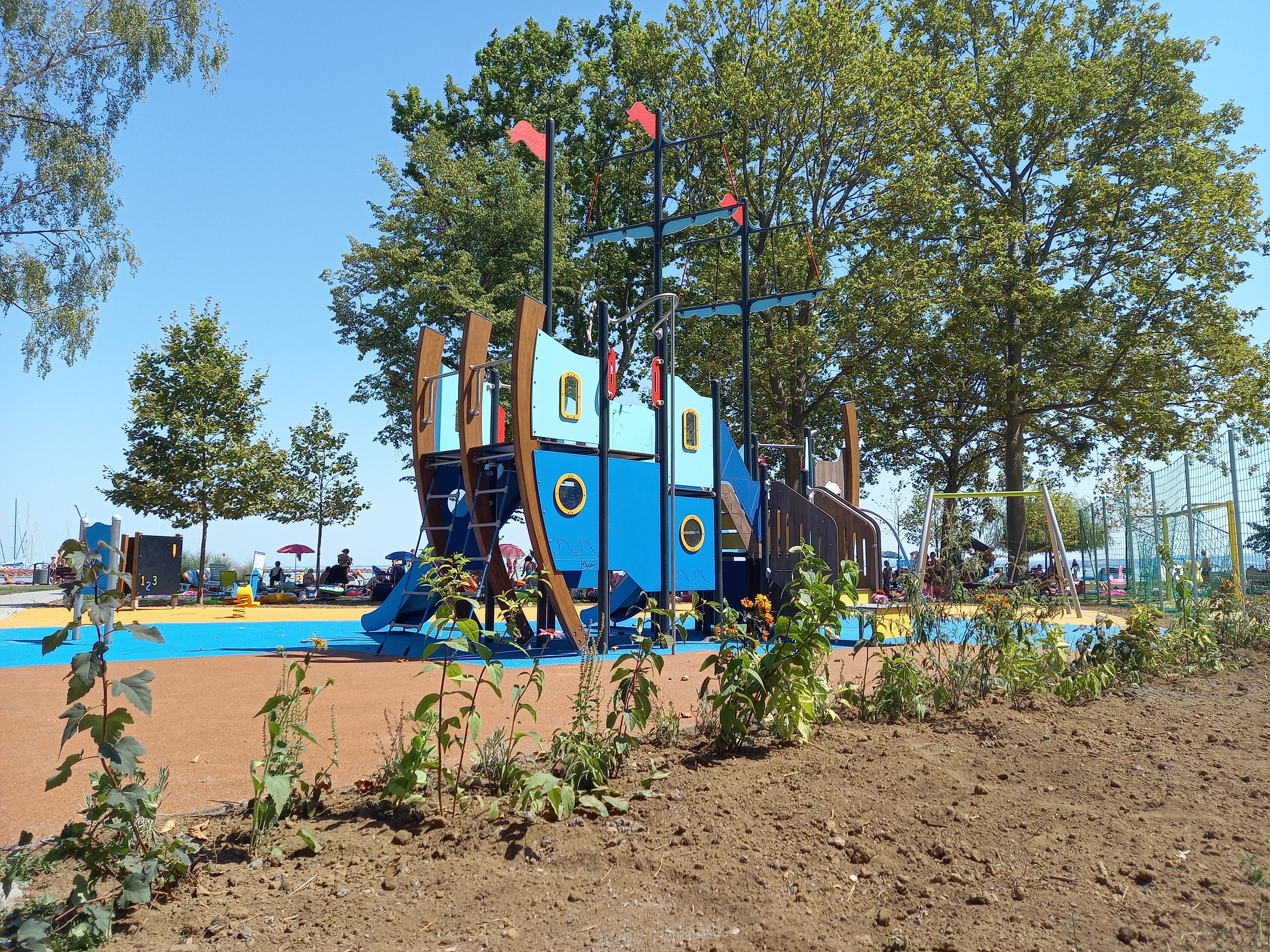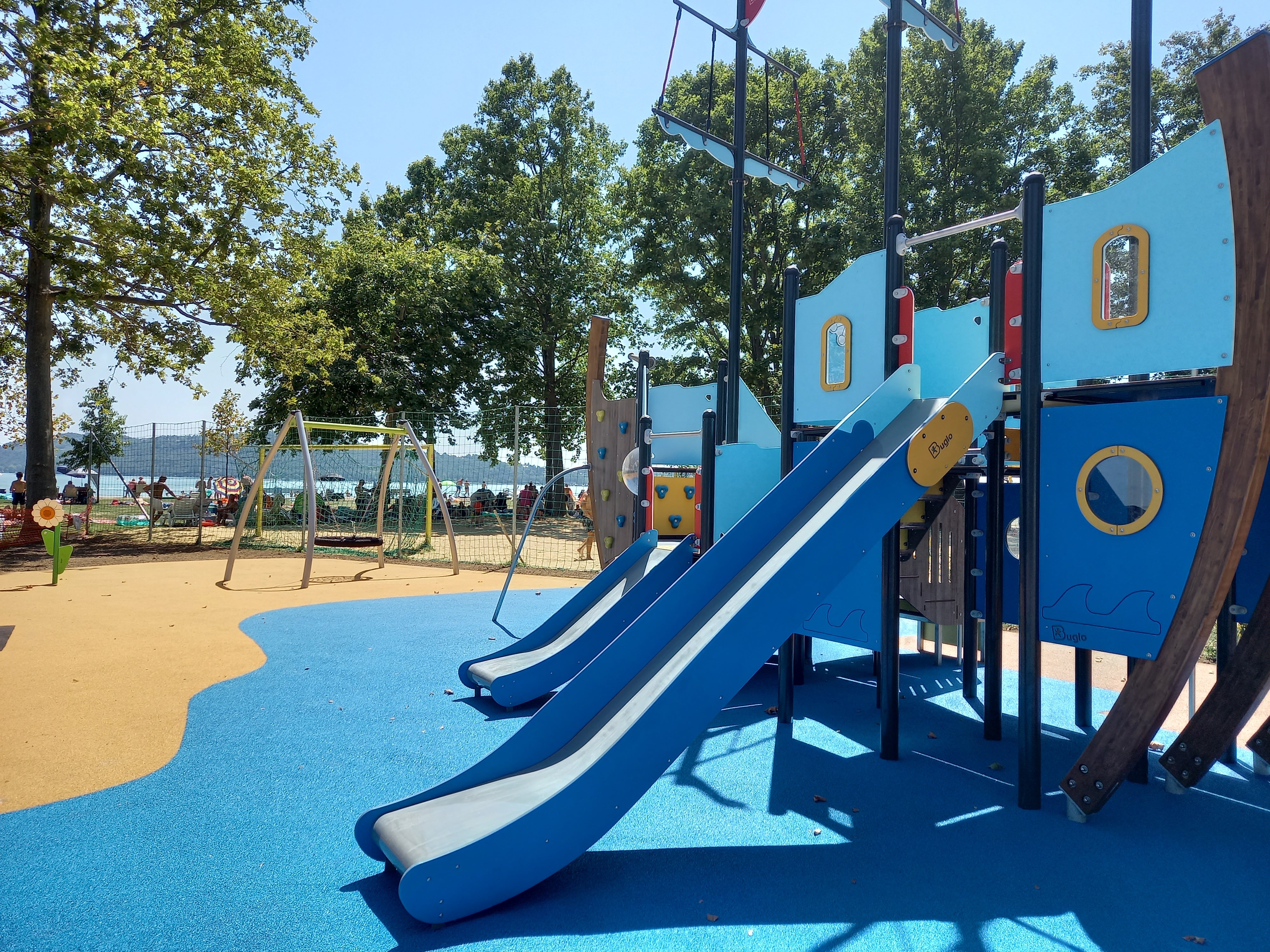 A nagy népszerűségnek örvendő üdülőhely egy integrált, hajó formájú komplex játszóeszközzel, fészekhintával, földbe süllyesztett trambulinnal és különféle edukációs elemekkel gazdagodott. Az ütéscsillapítást és az akadálymentességet kikötőhelyet szimbolizáló színes öntött gumiburkolat biztosítja a helyszínen. A fejlesztés a Balaton Fejlesztési Tanács Strandfejlesztés 2021 pályázat keretén belül valósulhatott meg.