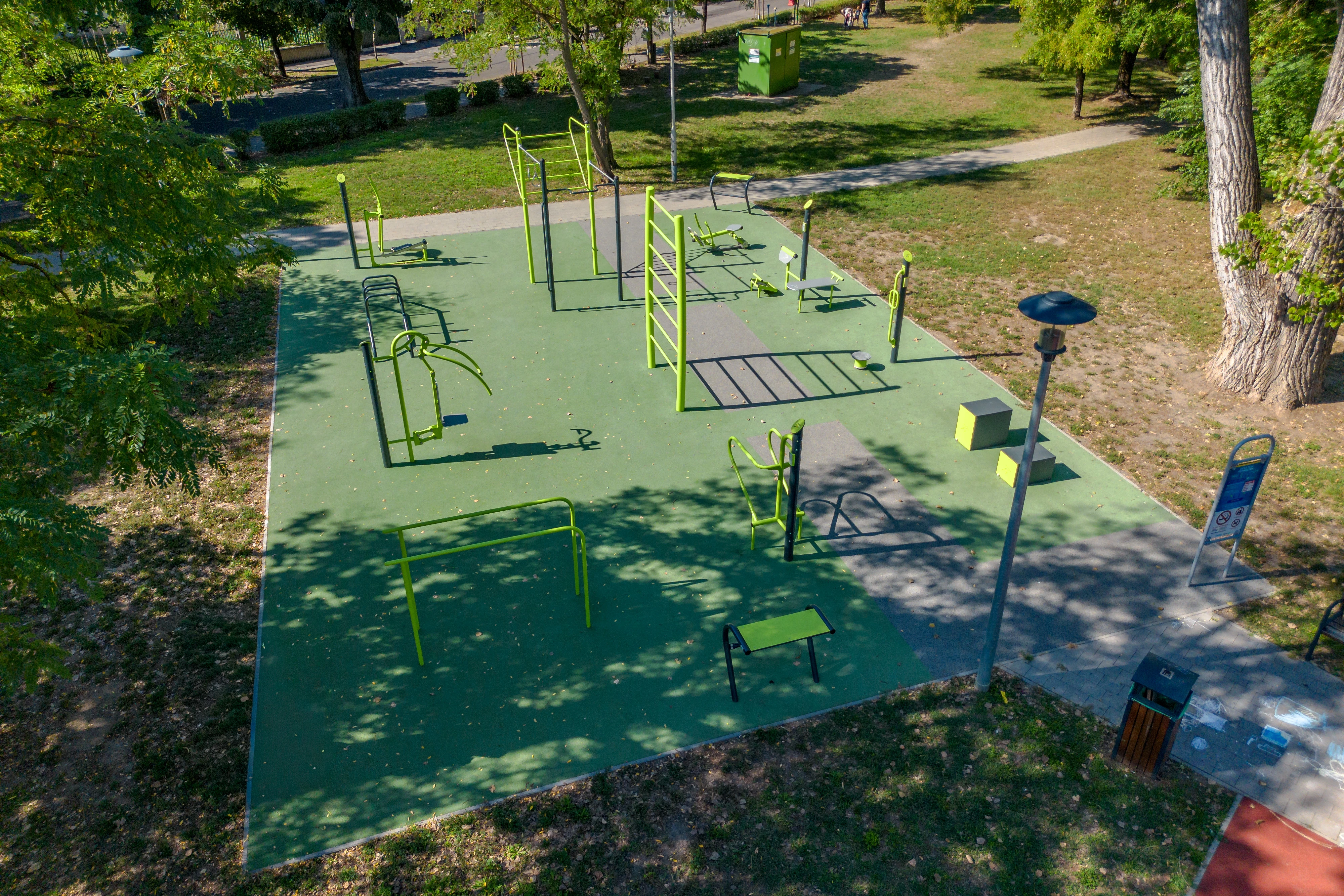 A kb. 200 nm nagyságú kültéri edzőpark (közel br. 23 millió forintos beruházás) hozzájárul a helyi lakosok aktívabb életmódjának elősegítéséhez, gazdagítja a kültéri edzőparkhálózatot, a Béke téri közpark funkcióbővítését. Az edzőtér terve a „Design for All” elvét alkalmazva igyekszik különböző szükségletekkel rendelkező felhasználók igényeire reflektálni. A terület nincs bekerítve, az akadálymentes, öntött gumiburkolat színe is ennek alárendelődve lett kiválasztva. A természetközeli zöld szín mellett megjelenik egy 1,5 méter széles szürke sáv is, mely vizuálisan és funkcionálisan is egyértelmű összeköttetést teremt a térkővel burkolt gyalogos ösvények között. Az eszközök is úgy lettek kiválasztva, hogy különböző nehézségi szintű mozgásformát támogassanak. Telepített eszközök: csípő formáló, haspad, hátizom erősítő, párhuzamos nyújtó, elliptikus tréner, evezőpad, kombinált húzódzkodó, dupla korlát, bordásfal, kombinált korlát, Lépegető padok.