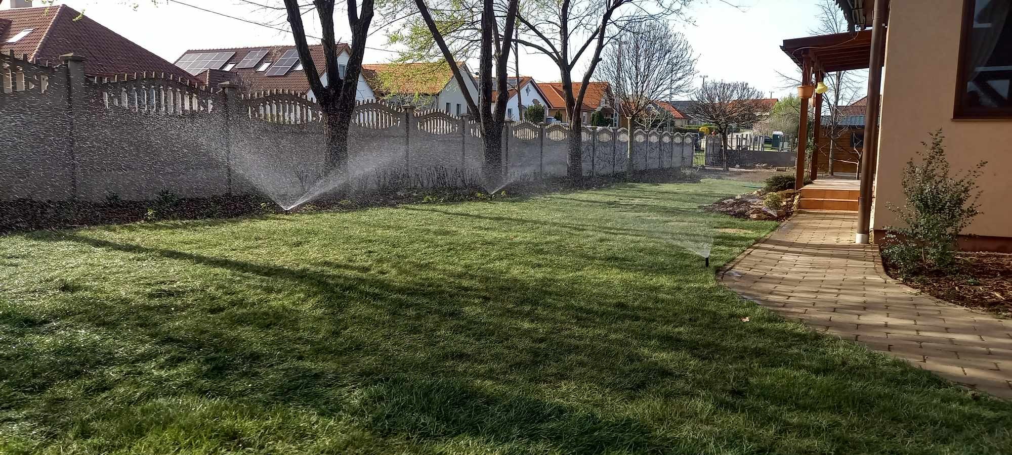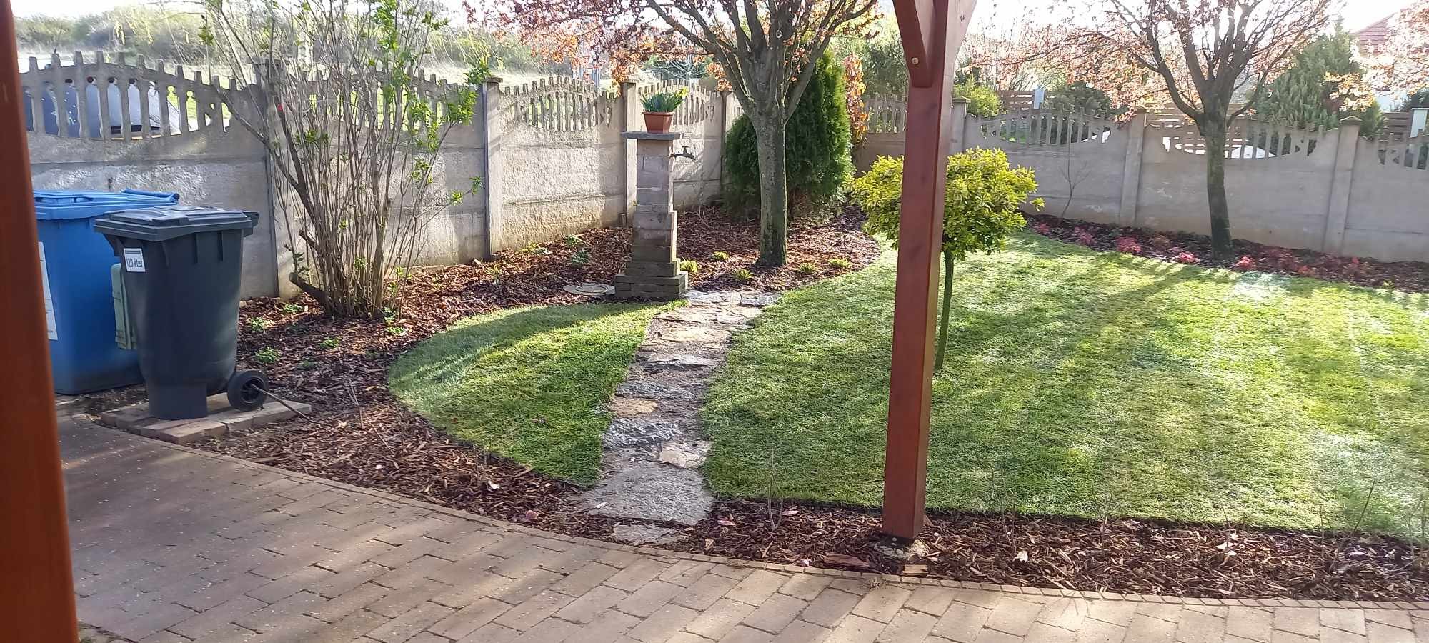 Ebben a nagy méretű kertben a feladatunk az volt, hogy a kert fele területét kompletten megtervezzük és kiépítsük, lehetőséget hagyva a kert későbbi bővítésére. A kútvizet a meglévő ciszternába automatizáltan bevezetve biztosítottuk a rendelkezésre álló öntözővizet az automata öntözőrendszer számára. A szilfák által teremtett mélyárnyékos helyekre árnyéki talajtakaró növényzetet terveztünk és telepítettünk. A terasz melletti sziklakertben a tavasztól őszig folyamatosan virágzó évelők gyönyörködtetik a teraszon ülőket.