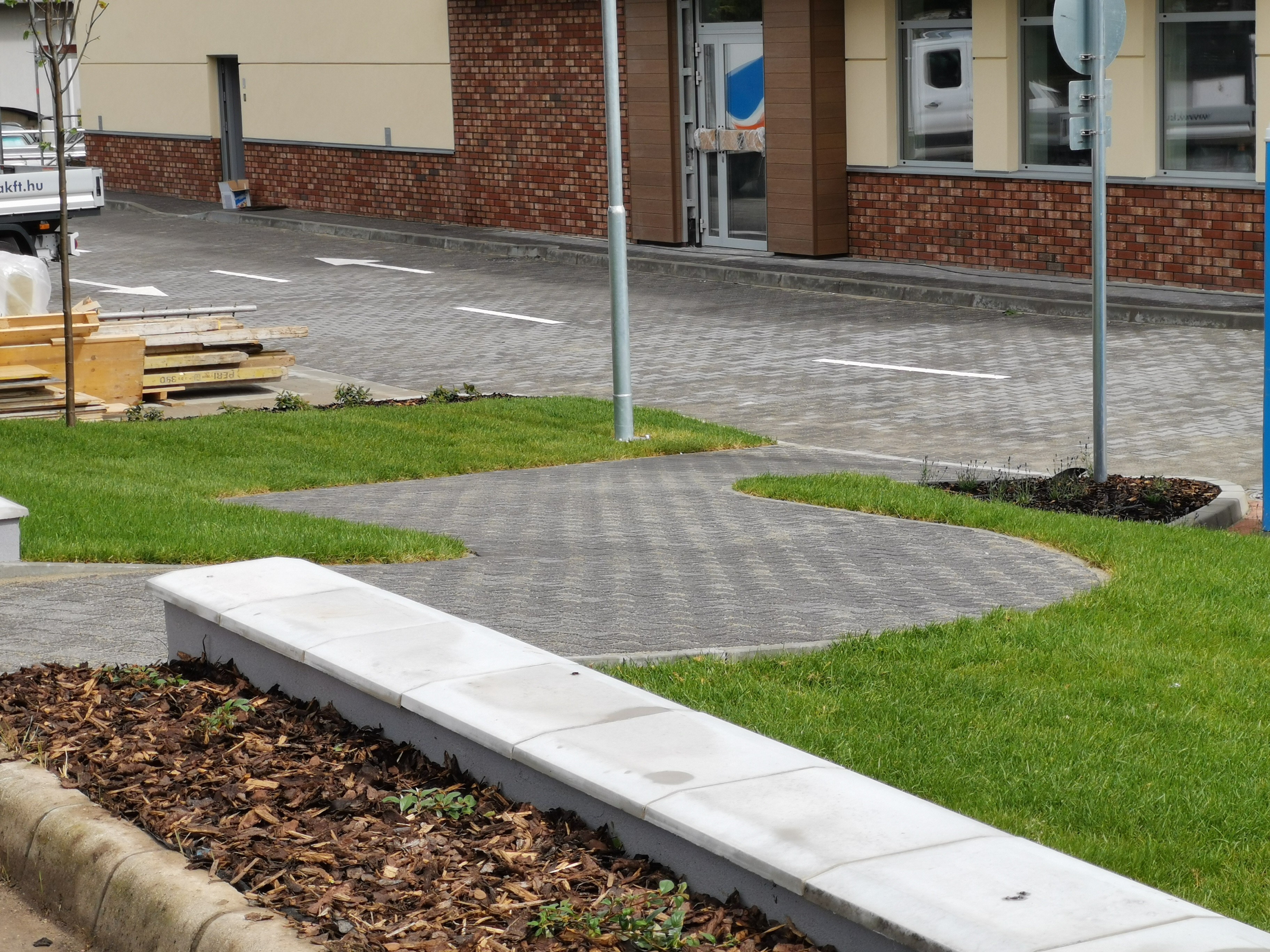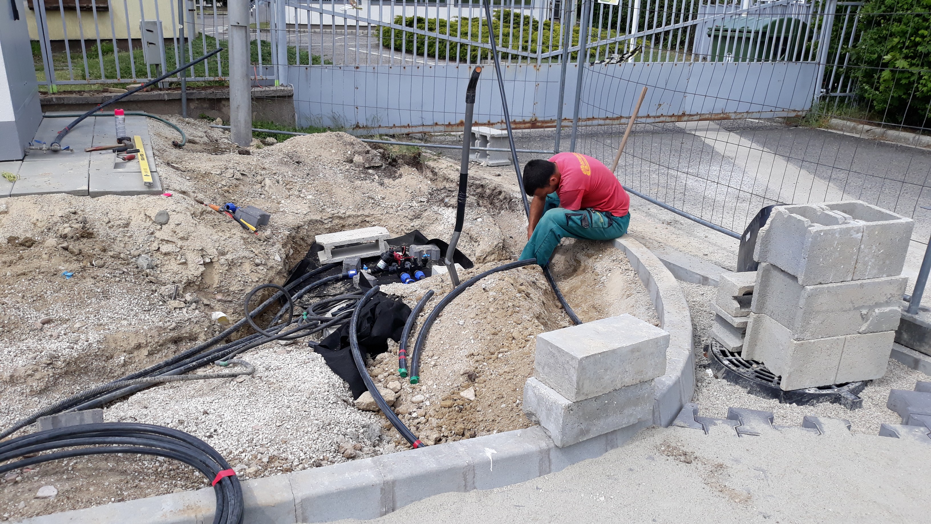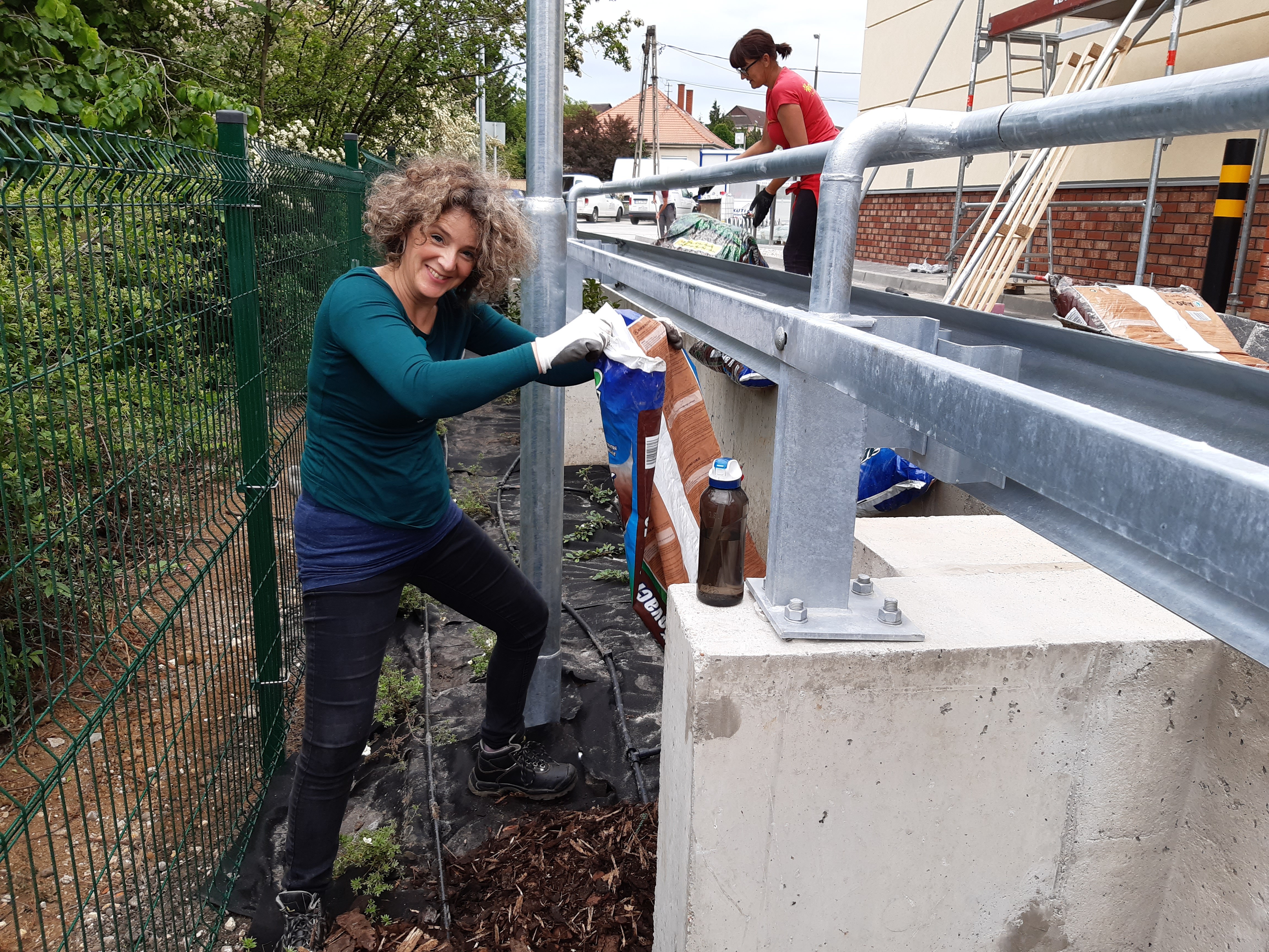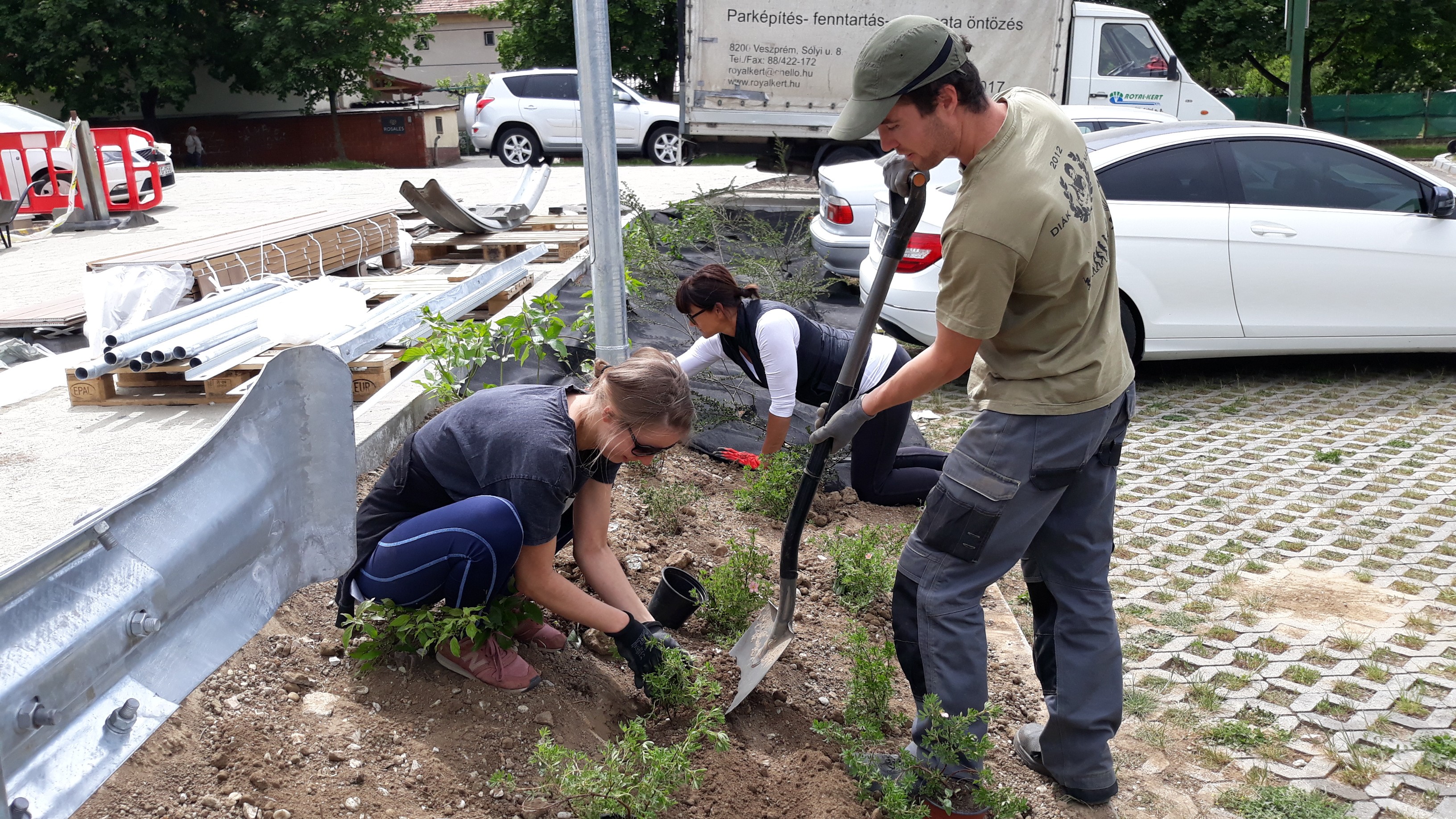 Ilyenkor rugalmas együttműködéssel, közösen gondolkodva, jól ütemezve, optimális feladatmegosztással igyekeztünk eleget tenni a kívánalmaknak. Gyepszőnyeget terítettünk és növényt telepítettünk, a növényágyásokat geotextíliával fedtük, végül mulccsal borítottuk. A folyamatos locsolást az automata öntözőrendszer biztosítja.